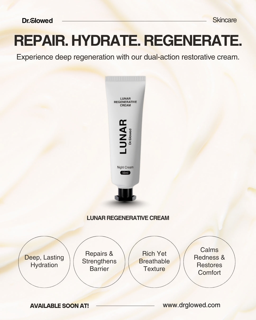 Born in the UAE and exclusively crafted in Korea, Lunar Regenerative Cream is a dual-purpose formula that functions both as a post-procedure recovery essential and a daily restorative moisturizer.